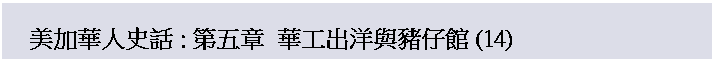 繼續閱讀: 第一章 美加華僑支持革命 第二章 美加華僑青年壯志凌雲 第三章 早期來美洲的華人 第四章: 刀光斧影 堂鬥風雲 第五章: 華工出洋與豬仔館 (1) 華工出洋與豬仔館 (2) 第六章: 飛剪黄埔 運豬風雲