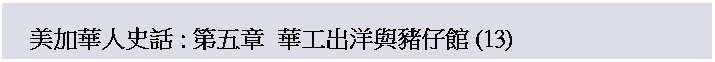 繼續閱讀: 第一章: 美加華僑支持革命 第二章: 美加華僑青年壯志凌雲 第三章: 早期來美洲的華人 第四章: 刀光斧影 堂鬥風雲 第五章: 華工出洋與豬仔館 (1) 華工出洋與豬仔館 (2) 第六章: 飛剪黄埔 運豬風雲