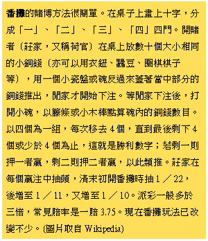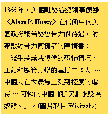 農場登記註冊苦力 波塔西歐阿新 前文提到,5分之4苦力工作於沿海農場,他們過的農場生活可謂典型的秘魯苦力生活。在講苦力農場生活前,先講一段近乎諷刺幽默的農場主人命名苦力的故事。南太平洋時報,1873年5月刊登了一篇文章,描寫某一農場如何登記註冊新來的苦力:農場上會說或懂一點西班牙文的資深中國家僕,被招來當翻譯;主人和工頭坐著,新苦力『一』字站開,也有些苦力不以為然的蹲著;農場的註冊簿攤開準備登記苦力;擔任翻譯的家僕,逐一的將苦力叫上前來,問苦力的名字,苦力回答阿福、阿蘇、阿德、阿慶等名字;接著檢驗苦力的證件,一切檢查無誤後,下一個重要的問題是該叫他什麼? 「哦,叫他卡利斯托(Calisto)好了!」主人說。 「不行,老闆。」一位管家說,「我們已經有一個卡利斯托。」 「我們有沒有薩穆爾(Samuel)呢?」 「沒有薩穆爾,老闆。」 「那就叫他薩穆爾。」 通俗的名字,像璜(Juan)、荷西(Jose)、佩德羅(Pedro)用完後,主人只好想出一些像卡利斯托、潘克西歐(Pancrasio)、波塔西歐(Protasio)等艱澀不常用的名字;命名苦力的困難解決後,註冊簿寫著:波塔西歐阿新,29歲,中等身材,膚色黃裏泛白,高額小眼大嘴,左手臂手肘以上有一疤痕。‧‧‧」如此,苦力註冊完畢,帶著他們的身家財產及工具,住進農場的工寮。 典型秘魯苦力 居住簡陋 日作十二鐘點 週入一索爾 農場的工寮(西班牙文叫Galpσn,暫且翻譯成「高棚」),是無法與梅葛斯築鐵路的工寮相比。有些高棚只不過是個大倉庫罷了,也有些是圍牆包圍住的幾間簡陋的房屋。因為氣候炎熱及缺雨,高棚不須要嚴密的屋頂,但是冬天苦力卻需要足夠的毯子來取暖。高棚內一切設備大概是最低限度,主人沒有必要提供「舒適」的住所。像軍營一般,每個苦力有一個小地方儲放他的個人用品:毯子、廚具、衣物及睡蓆。高棚每晚上鎖,因此苦力像囚犯勞工一般沒有行動自由。有一秘魯報紙報導,形容高棚為「既小又骯髒的住所」,苦力每晚8點或9點後就被關進「高棚內,沒有水和必需要的衛生設備」。 每天工作時間是12個鐘點,早上5點到下午5點或早上6點到下午6點,早上10點到中午12點之間有一個鐘點讓苦力準備當天的食物和吃飯。幾乎每個農場的慣例是讓苦力自己攜帶米和柴火,在曠野上隨地生火燒飯。南太平洋時報,1873年6月有一篇文章,描寫一個棉花農場一天的開始:早上4點半,每個農場一定備有的大搖鐘噹噹地發出集合信號;農場主人或總管抽著煙,等候小工頭報到;小工頭到齊後,放出整晚被關在高棚內的苦力;苦力匆忙的從竹床或竹蓆上滾「出」來,苦力中新升任的「小班長」也催促他們盡快行動;在昏暗的曙光中,一群哆嗦的中國人,穿著各式各樣的衣服,逐漸的排成一行,回應工頭的點名;苦力被分組後,領取當日的配給米及需要的工具;有經驗的苦力去開墾犁地,其他的拔野草、撿棉花、鋤地下種;每個苦力都帶著他的無價的飯鍋和昨天撿來的柴火上工。 苦力每天配給的主食是米,一磅或兩磅各個農場不同。有時他們分配到一個甜薯或一條玉米,和米一起煮,增加味道。星期日,有時分配到少量的魚或肉。發配的食物除了品質不佳之外,量也不一定足,發食物的工頭隨意拿起一個小杯或小容器,裝滿就算配給的數量。通常大的農場上有雜貨店,苦力假如願意或付得起,可以買一些豬油、茶、麵包或魚來補充每天的配給;一週一索爾的薪資,到了星期日已所剩無幾。英國觀察員柯爾的書中說:有一蔗糖農場,每天的配給是兩磅米和一磅山羊肉,有時苦力將山羊肉在雜貨店裏折換成鴉片。對了,雜貨店也賣鴉片。 中國新年放假三天 高棚賭局一日高潮 根據苦力的契約,每年在中國新年時有三天的假日。這三天他們可以做他們想做的事,譬如拜神(許多大農場上有設於小屋內的神壇)、放爆竹(假如他們找得到的話)或賭博。除了這三天,苦力通常一星期工作七天。有些聰明的農場主人發現給苦力星期日休息會產生較好的工作效率,於是星期日或至少半個星期日苦力不必工作(主人和工頭也可以休息一天或半天),同時也給他們一些肉來改善單調的飲食。但是額外的假日並不是沒有代價的,苦力必須延長他們契約來彌補額外的假日;因此八年的契約可能成為九年或九年半。 雖然做了一整天的工後,苦力已經沒有太多的時間和精力來消遣娛樂;但是為了排解單調苦悶的日子,放工之後,天黑之前,高棚之內經常有賭局。他們最常賭的只不過是猜單或雙數罷了,賭具和賭法都很簡單,與澳門賭場內的「番攤」賭法類似。南太平洋時報,1873年報導一局苦力單雙數的賭博:(甲乙兩家對賭)雙方對坐在地上,甲方在對坐中間的地上放一把豆子(或是玉米顆粒,或是咖啡豆);乙方從豆子堆中取走一些豆子(增加結果的變數),然後選單或雙數,用現金或現有的財物下注(譬如乙方選單數,甲方跟進下相當的賭注於雙數);旁邊的看客也下邊注互相對賭;兩賭家不得用手指碰豆子,豆子堆中的豆子用一根小木棍仔細的數。當豆子數到只剩下一小部份時,還有耽迷於賭的人繼續加注;單數或雙數的結果揭曉後,參與賭博的苦力對輸贏似乎認命而不很在乎。但是在一天辛苦的勞動後,賭博數豆子時所帶起對未知數的猜測及期望,給苦力單調的日子掀起了一些高潮與興奮。 秘魯法律苦力非奴隸 中國『移民』成奴隸 清政府「外務部」檔案中記錄,同治十三年有人寫