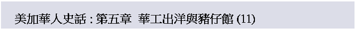 繼續閱讀: 第一章: 美加華僑支持革命 第二章: 美加華僑青年壯志凌雲 第三章: 早期來美洲的華人 第四章: 刀光斧影 堂鬥風雲 第五章: 華工出洋與豬仔館 (1) 華工出洋與豬仔館 (2) 第六章: 飛剪黄埔 運豬風雲