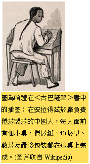 巧手紮菸如變戲法 石版印刷菸包裝 古巴的菸廠也用許多中國苦力。就像今日的遊客喜歡參觀古巴菸廠,哈薩也好奇的參觀哈瓦那著名的宏拉得茲〈La Honradez〉菸廠。宏拉得茲菸廠的工作用上千名中國苦力,人人各有專長,他們既有耐心,又能負荷重擔。哈薩描述中國人捲菸製菸的過程:「每人面前有個小桌,捲菸紙、填菸草、數菸及最後包裝都在這桌上完成。經過長期的訓練,靈巧的製菸及數菸的技術達到不可思議的地步。他們不是真正的數菸,全憑手感而知抓的一把菸是否有25支,或多或少;宏拉得茲菸廠的導遊告訴我,中國人憑手感抓菸幾乎沒有出過錯。」顧門〈Walter Goodman〉1872年在『倫敦社會〈London Society〉』雜誌發表『哈瓦那菸廠〈A Cigarette Manufacturer at Havana 〉』的報導。文章中詳細描述這位技術高超無比的中國神手如何數菸及包紮菸:「他面前有一堆鬆散的香菸 和一疊塗上膠水的香菸包裝紙,他一隻手的靈巧的手指伸入香菸堆中,憑感覺知道是否把握住26支定數的香菸。他的手怪異的抖動一下,手中的香菸一一攤平於包裝紙上。下一步,將所有攤平的菸連包裝紙輕巧而迅速的捲成捲筒;捲筒的一邊開口,另一邊包裝紙整齊的摺進而封口。他的動作快到我們〈參觀者〉的眼睛都無法追隨;整個工作過程對我們來說像變一場戲法。」哈薩的書中說一紮香菸有25支,顧門說當時一紮香菸有26支,可能不同時期,香菸紮行銷數目不同。無論25支或26支菸,中國人的紮菸技術達到出神入化的地步。 1850年代,古巴菸在歐洲國家是奢侈品,只有高檔的旅館和菸店才出售古巴菸。為了防止歐洲冒牌貨充斥市場,宏拉得茲菸廠每隔幾週就換菸紮包裝紙,如此冒牌菸廠無法即時跟進新包裝。這些色彩鮮艷,圖繪精細的包裝紙不久即成為收藏家的收集品。宏拉得茲菸廠規模龐大,因此擁有自家的石版印刷〈Lithographic〉廠,印製自家招牌的菸紮包裝紙。據1866年一位記者的報導,他到宏拉得茲菸廠參觀,看到許多中國苦力蹲在高腳凳上,操作複雜的彩色石版印刷機器。 古巴的其他各項主流經濟也都用中國苦力。有些農場的主人,選一兩名容貌好而且乾淨俐落的苦力當家僕;當家僕的苦力比較幸運,通常得到主人的信任,在農場上也有一些特權。小生意和小店也買一些苦力為工人;原本在中國是裁縫師的黃秋台,被賣到糖果店當店員;原本經營雜貨店的吳阿喜被賣到裁縫店當裁縫。被關在官工所的苦力是最不幸的:他們通常是契約到期,沒有續約也沒有財力回中國;或者是被逮捕的逃跑苦力;或者是輕罪犯。官工所的苦力,為古巴政府打免費工,有時候被出租當短期的廉價勞工。在主要城市,通常在半夜可以看到一連串用鐵鍊連住的苦力和黑奴清掃街道,古巴政府也樂得有苦力提供免費的清掃服務。 買賣租借奴隸交易 過世苦力契約回生 1849年,第一艘苦力抵達古巴後的第二年,西班牙公佈一套新法規,用以加強控制執行苦力契約。法規限制苦力的行動,也允許主人體罰苦力。苦力新法基本上是依照1842年古巴的奴隸法制定,中國契約勞工因此不明不白地被貶為奴隸。懲治奴隸的那一套刑罰:上手銬、腳鐐、枷鎖及鞭打,用在苦力身上完全合法。 1853年苦力買賣重新開張後,西班牙又於1854年公佈一套新的中國移民法規。理論上,新法的用意是修正舊法濫用奴隸制度於中國契約勞工身上。新法禁止體罰苦力,並且授與苦力一些有限的民權。苦力做滿八年工後沒有義務續約,即使苦力欠主人錢也不必續約。就像其他外國人一般,中國苦力滿約後可以申請居留、結婚、承襲子女的父母權,也可以買賣地產。此外,苦力可以控訴主人沒有按照新法規行事,甚至可以上訴到殖民官署。1854年的法規最重要的一項條例是給予25歲以上的苦力或做滿6年工的苦力,用金錢向主人贖回契約的權利。 表面上,1854年新法規給予苦力一些權利及保障;實際上,主人對苦力仍有很大的控制力,照舊實行上枷鎖、鞭打及扣押薪資等處罰。苦力沒有主人的書面同意,不得離開工作地;沒有同意書而離開工地被逮獲的苦力,不是關入官工所,就是由主人贖回,當然羊毛出在羊身上,贖金由苦力的薪資扣回;如此,苦力基本上等於囚犯。結婚及購買地產也須得到主人的同意。主人和工頭照舊以體罰來強迫做滿八年工後的苦力續約。買賣和租借苦力契約的慣常交易與奴隸交易沒有分別,契約只不過是一張紙罷了;但是當主人強迫做滿八年工後的苦力繼承一張過世苦力的契約時,這張紙才有特別的價值。 移民政策頻頻更改 總督公告執法「指南」 雖然苦力的主人有很大的權力控制苦力,但是他們還是無法完全控制苦力。針對解決農場場主的抱怨,西班牙於1860年又公佈一套鼓勵苦力續約新法令,新法規定中國勞工約滿後兩個月內如果不簽新約,就得離開古巴;如果沒錢買船票,就送進官工所。1860年以後的增訂的法令才說明,只有在1861年2月15日後抵達古巴的中國人必須遵從1860年續約規定。 古巴的中國移民法自1854年至1872年經過多次增定、減免及修改,每次更改明顯地加強限制中國人的行動,迫使中國人簽新約,因此若要在古巴獲得自由身是難上加難。頻頻更改的法令給雇主及執法人濫用或因利益而藐視法令的機會。1868年,古巴總督〈Captain General〉頒布「執法指南〈Instructions for application of the Regulations for the introduction of Chinese immigrants〉」,指示地方政府及