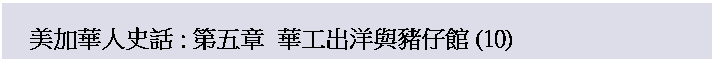 繼續閱讀: 第一章: 美加華僑支持革命 第二章: 美加華僑青年壯志凌雲 第三章: 早期來美洲的華人 第四章: 刀光斧影 堂鬥風雲 第五章: 華工出洋與豬仔館 (1) 華工出洋與豬仔館 (2) 第六章: 飛剪黄埔 運豬風雲