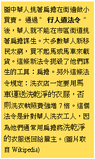 低微收入 如何生存? 1876年,三藩市政府代表皮斯里〈Frank Pixley〉在美國聯合委員會前陳述華工的價碼:有技術的華工每日收入50分錢到1元,鐵路和墾荒華工日入60分錢到1元,農場華工日入1元,摘採果實日入1.1元,全部華工自己供給吃住。皮克斯里又說:華工逼迫白人勞工餓死。 苦力是如何在低微的收入下生活、還債,甚至存錢匯回鄉?基本上,他們對生活安逸的要求非常低。白人勞工吃肉和麵包,苦力吃米飯、魚乾和醃菜,情況好的喝茶,沒錢的喝水。市政府代表皮斯里估計苦力一天的伙食費是10分錢。苦力燒飯的爐子是個黃銅小火盆或煤油鐵罐下墊塊磚頭,通常就在住的房間內開伙,假如煙味太重的話就搬到走廊上開伙。據證人說: 50名苦力聯合租房開伙,一天只要10元,每人分攤20分錢,白人勞工必須花上數倍的開銷過日子。白人家庭起碼的要求是兩房的公寓,有成年孩子的家庭的則需要三房。一間一家五口白人家庭嫌擠的房子,可以住100名苦力;雖然苦力付的整座房子的房租比白人高,但是一間20英尺見方的房間可以住40到50名苦力,每人分攤下來的租金很低。苦力睡三四層的疊床或者只要有一「蓆」之地,就能倒地而睡。 三藩市衛生官米爾斯〈Dr. John L. Meares〉作證時說:這些苦力住在很大的廉價公寓內,許多人擠在一間間的沒有通風設備的小房間內和地下室,排水系統差,住處非常骯髒;公寓與公寓間有過街巷的地下通道,也有很多人睡在地下通道內。 因為住處擁擠污穢,百病叢生。許多傳染病也在住處內散播,肺病、天花的病例不少,甚至有痲瘋病和性病。雖然六大會館答應會照顧生病的苦力或送醫,根據證人的描述,散佈在三藩市內的苦力「醫院」不過是一間間骯髒的小倉庫。衛生官米爾斯說:「他們〈指六大會館〉自己的同胞〈指苦力〉病在小醫院內,接受不人道的待遇。」米爾斯舉例在亞立克巷〈Aleck alley〉的醫院,一間間骯髒的小房間內,垂死的肺病或慢性病中國人躺在自己的穢物中挨餓,沒人照顧他們。米爾斯發現天花的病例後,召集六大會館的負責人,警告他們不可隱瞞天花病例,要求負責人絕對必須報告天花病例;接下來的兩三天,會館報告幾個天花病例,之後就無聲無息了。依據米爾斯的證詞,讓人懷疑六大會館是否照顧生病的苦力,是否盡「慈善」機構的義務? 築路採礦開荒墾地 貢獻加州經濟發展 有些苦力學了特殊工作技術也熟悉週圍環境後,找到高薪的工作,但是快速的加州經濟發展還是靠大量廉價而無技能的苦力。根據三藩市的估稅員估計,1876年有近30,000的中國人在三藩市工作:家僕、買賣香煙衣物、製造鞋靴;在罐頭廠裝水果、醃漬物及魚;也做洗衣工人、園丁、餐館工人。不只是三藩市,整個加州經濟及建設也靠苦力默默的帶動。 除了替中央太平洋鐵路公司築橫貫大陸的鐵路外,苦力也築加州當地的鐵路、運河、公路、電報線。1850年至1870年間,薩克門多-聖華金河三角洲〈Sacramento-San Joaquin River Delta〉造地〈Reclamation〉巨大工程中,大量的苦力站在水深及腰的沼澤裡清除蘆葦,造堤防,排水,轉濕地為旱地。沼澤地帶蚊蟲多,找不到白人勞工在沼澤裡工作。苦力開墾了近五十萬畝肥沃的農耕地,薩克門多-聖華金河三角洲的農地成為今日全美國農產價值最高的農地。 農作物收成時期,苦力的腳步踏遍加州各農場,掘馬鈴薯、摘草莓和葡萄。無可否認,他們做的工作大多是低技能,很少參與沉重或危險的工作,也不適合當卡車司機;篳路藍縷,細水長流,他們為苦力商帶來莫大的財富,他們為加州帶來迅速的建設發展。 500立方尺空間法 反苦力情緒高漲 早期來美洲的華人,大多數帶著「過番揾銀,落葉歸根」的心情,他們不想也不無願意融入西方社會的文化和風俗。華人自成一族,吃他們習慣的食物,穿他們習慣的衣物;前額剃髮,留著長辮,戴瓜皮帽,靴褲之外穿著中式的掛袍。華人的衣服大多由本地中國裁縫師製造,有錢人則從中國進口鞋靴衣物。華人勞工,為了工作方便也夾雜的穿一些西式衣服。在歐洲移民當道的白人社會中,華人顯得格格不入,遭到白人異議。聯合委員會報告第185頁,前加州州長駱〈Frederick Low〉於1876年作證時,以「雜種狗似的〈mongrel kind〉」字眼形容中國人的衣著。十九世紀、二十世紀初的媒體不如今日的媒體發達。大部分的人因沒見過外界世面,思想保守狹隘,不願意接受異己。 群族的本性使得相同膚色、語言、文化和習俗的人喜歡聚成一群族,互相保護。沒有利益衝突時,各個群族和平共處;當利益衝突時,尤其是經濟利益衝突時,失利的群族一定會反抗鬥爭。華工的刻苦耐勞及韌性幾乎將白人勞工驅逐出加州的勞工市場,或者逼迫白人勞工接受較低工資。加州淘金潮全盛期〈1848-1855年〉過後,1860年開始加州經濟疲軟;原本靠淘金維生的白人勞工,找不到滿意的工作,開始責怪華工搶了他們的飯碗,找到代罪羔羊。加州移民協會〈Immigration Association of California〉會長布里格斯〈Arthur Briggs〉1884年作證時表示:華工在築鐵路、清沼澤造地時,白人勞工多數在金礦工作,當時華工的確有建設加州的重要性;但是此時非彼時,現在白人也做華人的工作,在農場、工廠工作或是做有一天沒一天的日工。布里格斯認為必須限制華人占有白人的工作機會,限制華工移民。布里格斯的證詞反應當時大多數白人的心聲,反華的情緒早在1860年期間開始蘊釀。 1870年,