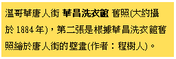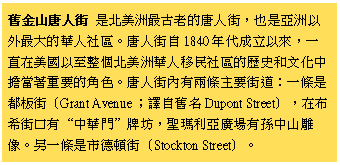 舊金山出現唐人街 加州淘金潮正漸漸退潮,山中黄金快掘盡之時,在金礦工作的機會也同時減少了。來美國掘金中國人,有的發了財,買船票回老家去,做令鄉人羨慕的「金山伯」,買田蓋屋,安享下半生。有的還沒賺到可以衣錦還鄉的地步,就留在美國繼續工作。他們對環境的適應能力很強,不掘黄金,就改做別的工作。其實做別的生意,好比供應掘金的日用雜貨,比掘金更容易和有把握致富。當時中國人掘金,風險很大。露宿礦場掘不到金子,固然辛苦;掘到金子,提心吊膽怕被搶。掘金時期有句話:「連碰到個中國人的運氣都沒有」,形容倒霉的人連一個中國人都碰不到,別談有那個運氣去搶劫中國人。可見當時掘金的混混認為搶中國人手上的金子,也是發財之道。 舊金山的「唐人街」出現了。1850年時,舊金山市巳有七百名華商,他們經營餐館、洗衣店和其他商店。從現在的格蘭街向堅尼街發展過去, 有三十三家華商雜貨店,十五間中藥店(舊金山只有幾位西醫,以致中藥店門庭若市)和五家唐餐館。他們的顧客有華人,也有洋人。這是北美最老和最大的華人社區。當時海外的中國人自稱「唐人」,中國菜名「唐餐」,中式衣服名「唐裝」,家鄉名「唐山」,一切冠上「唐」字,他們自稱聚居的那幾條街為「小廣州」。「唐人街」之名,卻是美國產品:把華人聚居的社區稱為Chinatown是美國報紙的傑作。1853年,美國報紙開始稱舊金山華人聚居的那幾條街為Chinatown。中國人把它譯成「華埠」或「唐人街」,習用至今。 今日舊金山唐人街的特色:中國式牌樓和飛檐式建築,也是美國人的噱頭,依照好萊塢電影佈景造成,以興旅遊。開始的時候,美國導遊帶外地的遊客來唐人街開眼界,為了博取小賬,他們繪聲繪影的把幾條橫巷講成賭館或妓院所在,暗示該地曾經發生「堂鬥」或兇案。在唐人街做生意的,不堪其擾,齊向旅遊局抗議後,導遊才比較收斂。 華人為什麼自稱唐人 為什麼中國人在清朝的時候去外國,自稱「唐人」,避用「清」字,說起來有很長遠的故事。 有人說,廣東在唐朝時開發,唐朝又是中國國勢最強盛的時期,在海外自稱「唐人」是很有面子的。福建在漢朝開發,他們的用辭中就多「漢」字,如漢藥、漢醫等,和廣東人不同。另一說,漢朝向北方發展,所以韓國、日本稱中國為「漢」、中文為漢文、中藥為漢方;唐朝向南方發展,所以南方國家稱中國為「唐」。「唐山大兄」的稱呼,只有在南洋才聽得到。 又有一說是受在海外有龐大潛勢力的幫會影響。那時,洪門的三合會在南洋和北美地區發展迅速;中國的早期海外移民中,很多是洪門兄弟,他們具有極强的民族意識,反抗滿清政府統治中國,一心想恢復明室。因此這些海外移民,決不肯承認自己是「清人」或「清國人」。只有日本人稱中國人「清國人」,或蔑稱「清國奴」。洪門的文件中,沒有這個「清」字,他們寫成三點水加個月:「清」字少了個「主」。表示滿清不是他們的主人,可見其民族意識的强烈。 清代海外華人覺得自稱「明人」,可能會引起滿清政府對住在家鄉的親族不利,而廣東人既然習用「唐」字,不如自稱「唐人」。 「唐」、「僑」與「華僑」的來源 『明史』卷324『真臘國』條:「唐人者,諸番呼華人之稱也,凡海外諸國盡然。」真臘在今日的柬埔寨內。可見「唐人」名稱,在宋朝已有,盛行於明清兩代。南洋人稱呼中國人為「唐人」;美洲華人亦以「唐人」自居。 「僑」的意義是「客」:寄寓外地的人。早在東晉時期,五胡亂華,百姓南奔,稱為僑人。『興地考』記載:「自東晉成帝,中原流民多南渡,逐於江漢淮之間,僑立州郡以撫其名。南宋仿六朝僑寓法,撫輯南奔難民,分設僑治。」可見「僑」字引用,由來已久。 「華僑」一詞始於清朝。光緒二十三年,梁誠公使的奏摺、戴鴻慈『出使九國記』裡已經用「華僑」這個詞彙。最早的官方文件中使用「華僑」的是宣統元年八月憲政編查館印行的『華僑參議員議事辦法』文件。當時準備立憲,正斟酌華僑參議員名額。後來,流寓國外的中國人一概稱「僑民」,或「華僑」;華僑成為旅居海外中國人的通稱。 衣館、洗籠、八磅生涯 舊金山「唐餐館」首先在門外插上三角黄綢旗子,招徠中外顧客,供應中式美食,大受歡迎。於是華人的餐館向北美各地進軍,至今除了大城市中唐人街餐館林立,即使在小鎮市中,也會看見寫中文招牌加上英文Chinese Food的「唐餐館」。只是有些餐館供應的菜餚,為了適合洋人口味,四海一家,中西合併,已非正宗,成了「雜碎館」。也有很多華人學會做西菜,開設西菜館,生意一樣興隆。美國許多商船和軍艦的廚子都是華人。 洗衣館繼餐館而起,成華商一大行業。在1869年以前,加州人口百分之七十是男性,人們視「洗衣」是婦女工作,男人不做。因此如何洗淨穿髒了的衣裳,成了困擾大眾的問題。當時舊金山有些紈袴子弟,甚至把襯衫送到香港去洗熨,一打襯衫要付十二美元,四個月後運回來。後來改送去檀香山洗熨,一打襯衫減收八美元。1851年,李華在舊金山開設第一家華人洗衣鋪,在華盛頓街和格蘭街轉角,一打襯衫只收五美元洗熨費,不只价錢便宜,而且很快就洗好了。華人洗衣鋪正適合當地人士的需要,頓時門庭若市,生意大好。華人紛紛開洗衣館,到1870年,舊金山華人開了二千家洗衣館,控制了全市洗衣業。再發展到西部各城市,家家生意興隆。有的洗