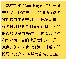苦力逃脫浮動地獄 反抗劫船焚船沉船 苦力船長的最大挑戰是如何長期(4到6個月)控制這麼多過著非人生活的「不自願」移民;刑具有前文提到的腳鐐、牢籠及鞭撻用的柱子。有經驗 的船長為了控制方便起見,將苦力編成大約50人一組;每一組有指定的組長、廚子、理髮師及其他職位,就像軍隊編制一般。每一個職位有少量的薪資,雖然錢數不多,但多少有些鼓勵作用。苦力的船艙與船員的船艙有高牆阻隔並且有持武器的守衛站崗;苦力的船艙出口有鐵柵欄;為了防止苦力反抗暴動,備有大炮對準船艙出口以防萬一。苦力暴動的故事不是空穴來風,幾乎每一次苦力船出海,都有些苦力以走極端的方式來逃脫這浮動地獄。消極者走自殺的路線,在港口內跳水或跳海。較積極的苦力以焚船(苦力分組自己開火燒飯,因此放火很容易)或帶頭組織暴動劫船。據多方記錄,1847年至1874年之間,開往中南美洲的736次苦力船航程中,發生68次苦力暴動劫船事件;4千多中國人加上12名船長及2百多名船員因此喪生。根據香港報紙報導,單是1865年8月至1866年4月,8個月間就發生了16件船上乘客暴動事件,每一件暴動事件都與苦力有關:強者接收苦力船控制權;驚慌者在船底鑿洞沉船或放火焚船。有時暴動發生後,船員封了船艙的出口,然後棄船而走;船底的中國人因為無法上甲板而被活活的悶死、燒死或淹死。 花神殿號與偉弗利號 魂斷艙底慘絕人寰 1859年,廣為媒體報導的花神殿(Flora Temple)號事件是一個船長及船員棄船而走的例子。英國人僱用的美國苦力船花神殿號,載著850名苦力,於1859年10月8日離開澳門,前往哈瓦那。三天後,船上的苦力反抗暴動,先在船艙內喊失火,然後趁機殺了一名守衛。鎮壓叛變之後,船長將所有的苦力像犯人一般關在甲板下。10月14日,花神殿號遇暴風雨後觸礁,船長及49名船員乘救生艇棄船逃生;留下850名被關在甲板下的中國人;即將沉沒的花神殿號和最近的陸地有300哩的距離。11月2日,一艘法國船到花神殿號觸礁地點探察,只看到幾片飄浮的花神殿號船板,沒看到一名生還的中國人。 1855年,偉弗利(Waverly)號事件也是慘絕人寰的案件之一。偉弗利號由汕頭出發,載著450名苦力前往秘魯。起程後,船長因痢疾而過世;偉弗利號的大副范曲(French)在沒有替補船長之前,不願意繼續航行,因此改道,於1855年10月25日進入菲律賓的馬尼拉港。馬尼拉的地方官怕痢疾傳染病漫延,隔離偉弗利號於馬尼拉南灣的甲米地(Cavite)。根據大副范曲事後的證詞:10月27日,苦力廚子罷工,要求拿到薪水後才開工;不滿意范曲的「將會盡力而為」回覆,苦力於是突破船艙尾部的出口;范曲命令手下將苦力抓回到船艙內,在扭打混戰中,四或五名苦力中彈,其餘全被逼到甲板下。筆者猜測廚子罷工的真正原因是苦力想利用這難得在東南亞靠岸的時機,爭取上岸機會逃命。稍後,根據范曲的說法:范曲發現苦力不但盜取糧食還闖入船上的蓄水庫盜水〈大概是因為廚子罷工,饑渴的苦力決定自行解決飲食需要〉,憤怒的范曲開槍殺了一名「不知恥」的中國人;一會兒,苦力又試圖突破前船艙的出口的鐵柵欄,范曲命令手下封住所有船艙的出口;是夜,范曲還從船艙口的隙縫倒入滾水以「恐嚇他們」。隔日,封艙後14小時,僱用偉弗利號的苦力商上船,命令范曲開艙,發現艙底近300具苦力的屍體:上吊、割喉、溺於水缸或被刺殺,景象令人毛骨悚然。范曲宣稱苦力是互相謀殺而死;其實,苦力是受不了饑餓、疾病悲慘的苦力船生活及船員的虐待酷刑,集體自殺而死。根據一名生存的李姓苦力描述:出海後,我們被關在艙底,有些被關在竹籠內,有些被鏈條鎖在鐵柱上;有些人無緣無故被選中鞭打一番,用來恐嚇威脅其他人;因疾病、饑渴甚至跳海而死的,不計其數。事後,范曲及其手下被關入監牢,等候官方的調查是否有刑事責任。偉弗利號上劫後餘生的苦力上了另一艘德國苦力船,繼續他們去秘魯的苦力航程。 亡命盜匪奪挪威號 螳螂捕蟬黃雀在後 苦力暴動劫船的新聞傳播各處後,中國沿海的海盜也假裝成苦力上苦力船,加入奪船活動。知名的美國巨型飛剪船挪威〈Norway〉號苦力暴動事件,有戲劇性的經過,悲劇性的結果。號稱「雄風飛剪〈Magnificent Clipper〉」的挪威號,噸位達2,424噸。她在1857年離開紐約港,載著煤炭運往美國在中國海的海軍艦隊。途中經過利物浦〈Liverpool〉,又為香港的英國軍隊載運一些武器。挪威號在香港卸貨之後, 船主就改造底下兩層船艙的設計,成為一層層的沒靠背、沒隔板的睡位架子;所有的通氣艙口〈Hatchway〉都加蓋一個半圓球型鐵條製的柵欄,防止船艙下的人上甲板。從此,這條運煤炭軍火的超級飛剪船挪威號就開始經營利潤無比的「人頭貨運」生意。她載過一些苦力由香港去澳大利亞的金礦開礦。1859年,澳門的大苦力商華加斯公司〈Vargas and Company〉僱用挪威號運一批苦力去哈瓦那。因為英國的「1855年中國船客法案」禁止非英屬目的地〈哈瓦那是西班牙屬地〉的苦力船在英屬的港口接收苦力上船,挪威號只得開往澳門,停在港口幾哩外,接收澳門豬仔館用舢舨送上來1,037名苦力。挪威號船上還有一些非苦力的乘客途經古巴回美國,這些乘客在甲板上的客艙房有障礙物保護;其中有一名美國人霍登〈Edgar Holden〉於1864年,在哈潑雜誌〈Harper’s Magazine〉曾經發表文章,描述他所經歴的挪威號暴動,還附有幾幅手繪圖